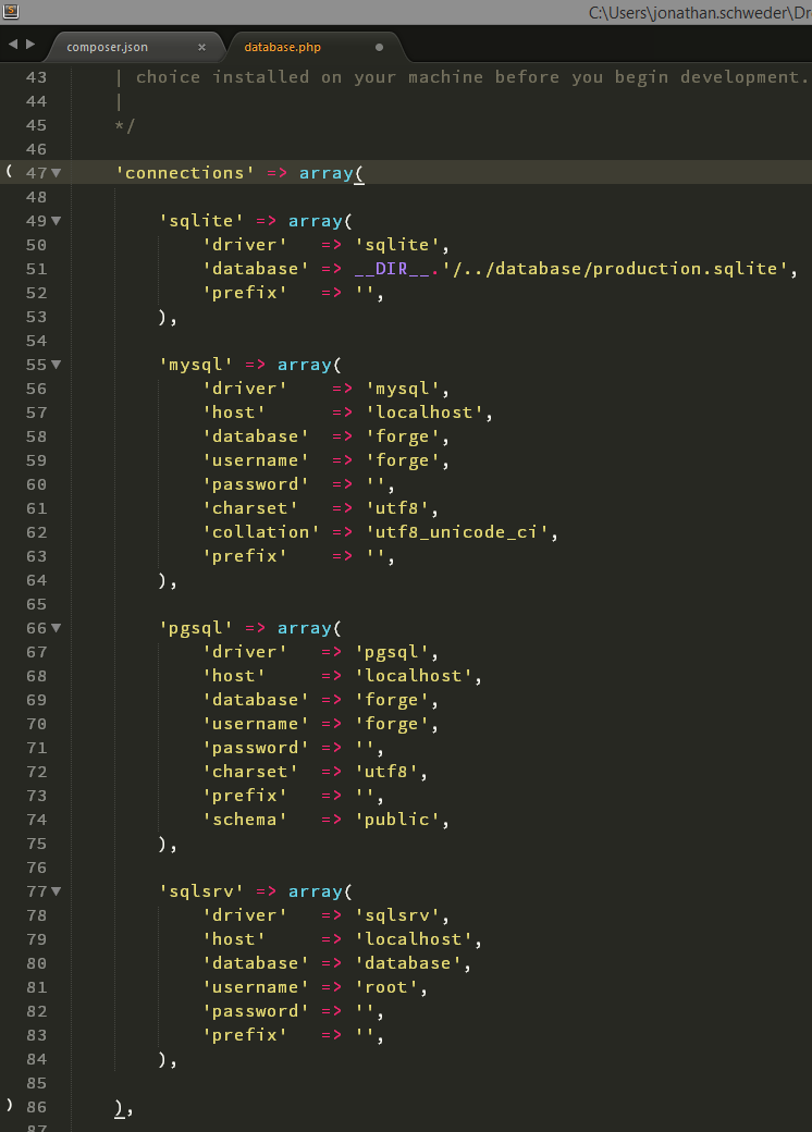 Após ter feito a instalação do framework e suas dependências, precisamos configurar a conexão com o banco para que o artisan funcione corretamente e faça a geração das tabelas, então vamos lá.Na pasta raiz aonde foi feito a instalação do laravel, abra o arquivo “appconfigdatabase.php”, este arquivo também não é nenhum segredo, novamente uma matriz, conforme dito usarei o mysql nesse tutorial porém o laravel possui nativamente suporte para SQLite, PostgreSQL e SQL Server além do MySQL, para qualquer um deles você precisa apenas alterar as configurações, segue imagem de exemplo: